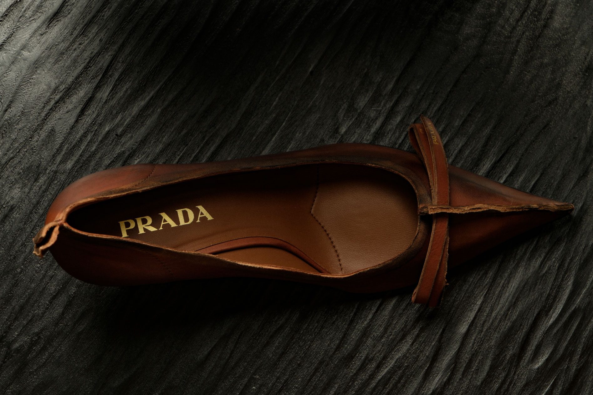 Runway pumps crafted in rich cocoa-brown antiqued leather, defined by a sharp pointed toe and a sculptural curved heel. A refined, tactile finish gives the silhouette depth and character — pure Prada elegance with a modern, architectural edge. |
