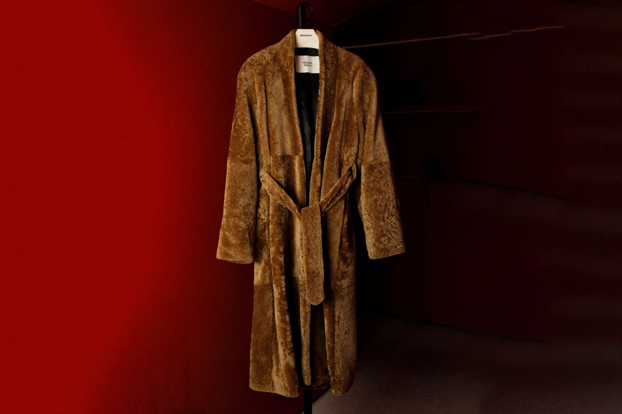 A belted robe coat in rich tobacco shearling with a high collar, raglan sleeves, and softly rounded padded shoulders. The shaved, textured shearling has a fluid, velvety finish, complemented by a black silk lining for a luxurious drape. tobacco shearling, shearling coat, belted robe coat, high collar coat, raglan sleeves, padded shoulders, shaved shearling, velvety finish, silk lining, winter outerwear, luxury shearling, statement coat. |