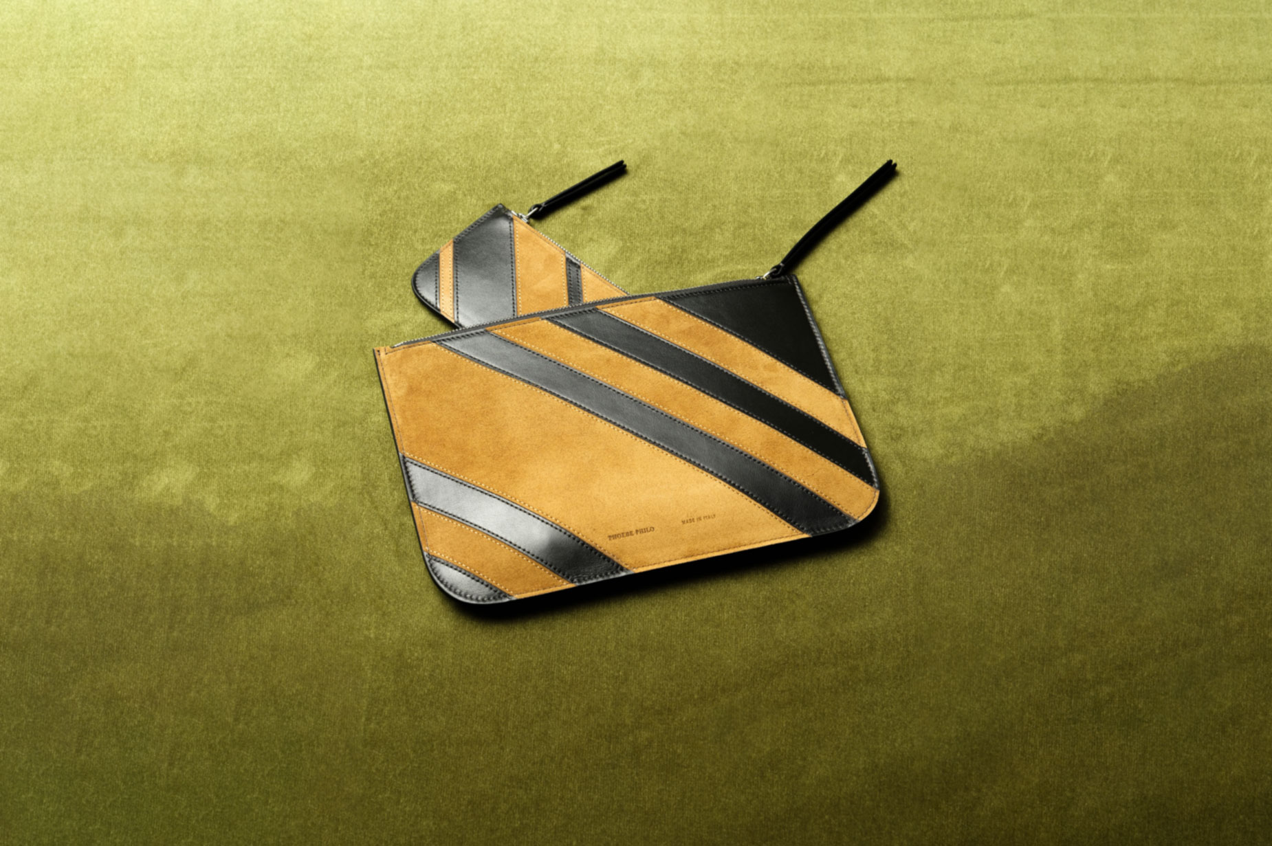 A modern duo crafted in black leather with toffee-suede intarsia. The Rocket pouch features a curved base, suede lining, and a smooth zip fastening. The pocket card holder matches with a compact zipped compartment, an external card slot, and leather lining. Clean lines, strong contrast, and elevated everyday style. |
